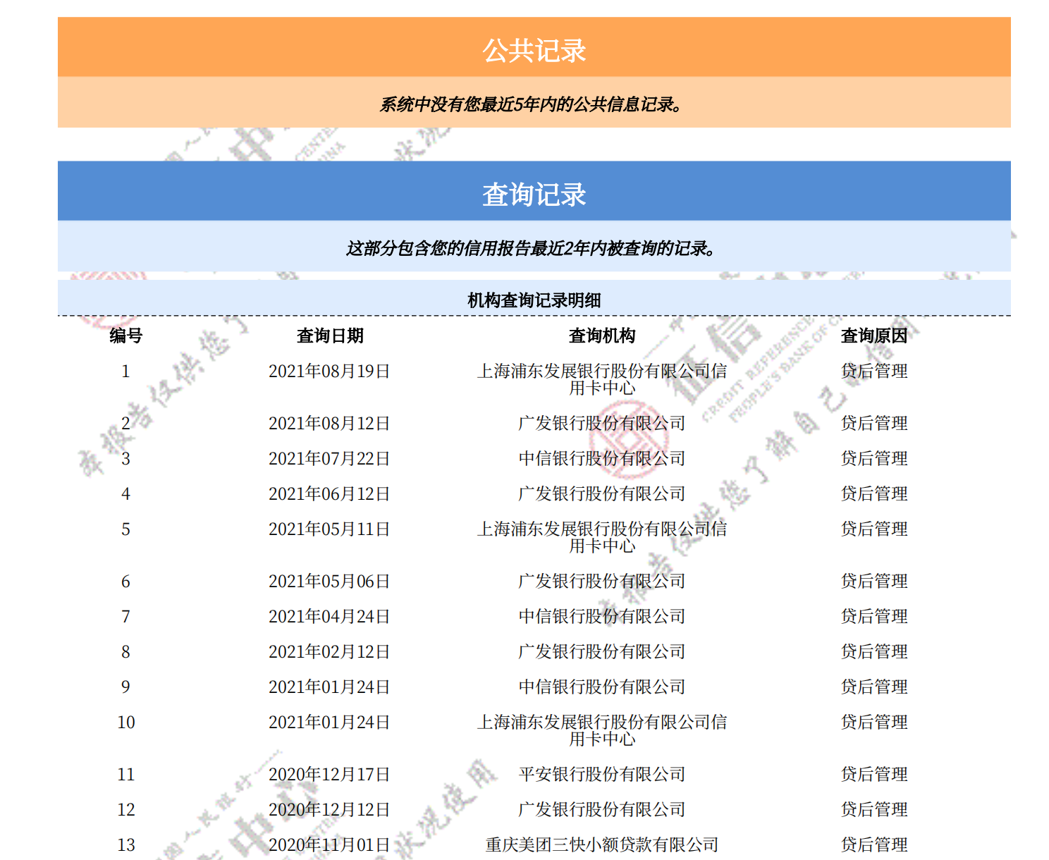 个人信用报告:根据个人的信用信息,生成个人信用报告,包括个人基本信息、信用卡使用情况、贷款记录、逾期记录等内容。