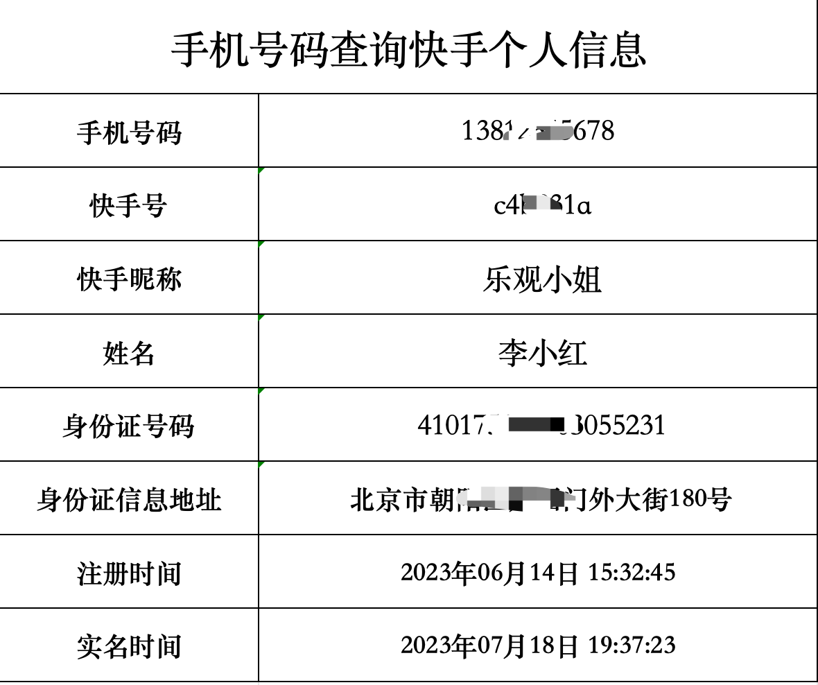即知道小红书或抖音或者快手号,查出此号的身份证正面信息。包括姓名,身份证号,身份证地址。
